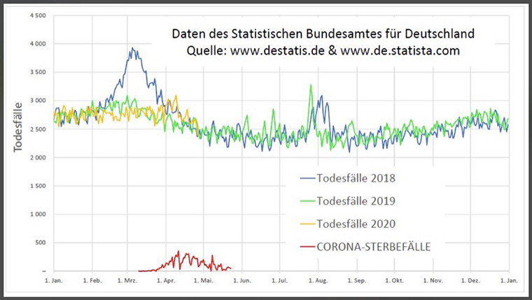 Die Quelle dieser Grafik ist mir nicht bekannt! Sie ist aus: https://www.facebook.com/photo?fbid=3338046566215106&set=a.485814314771693: Die Grafik bildet die Sterblichkeit pro Tag ab. Ich glaube zwar, dass die Daten vom Satistischen Bundedamt kommen, aber die Grafik kommt sicher nicht von de.statists.com oder von destatis.de.